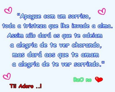 Não devemos dar muita importância ao que os outros vão pensar ou falar... O que importa é sermos realmente felizes, não importando o quanto você possa parecer bobo ou errado, frente aos olhos de quem nunca vai saber o que realmente se passa em sua mente ou no seu coração... Problemas... Esses todos têm, podem ter certeza! A diferença é saber que um dia todos eles, mais cedo ou mais tarde, vão se resolver, e, provavelmente, daí surgirão outros. Não podemos ficar esperando a ausência de problemas para sermos felizes! A felicidade está aí, de graça e prá quem quiser tê-la, o que precisamos é saber enxergá-la em cada pequeno presente que recebemos o tempo todo em nossas vidas!”